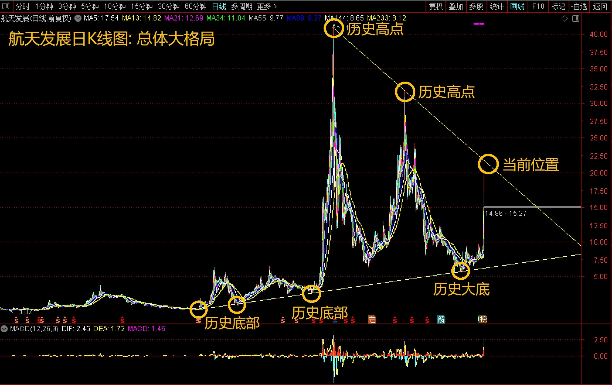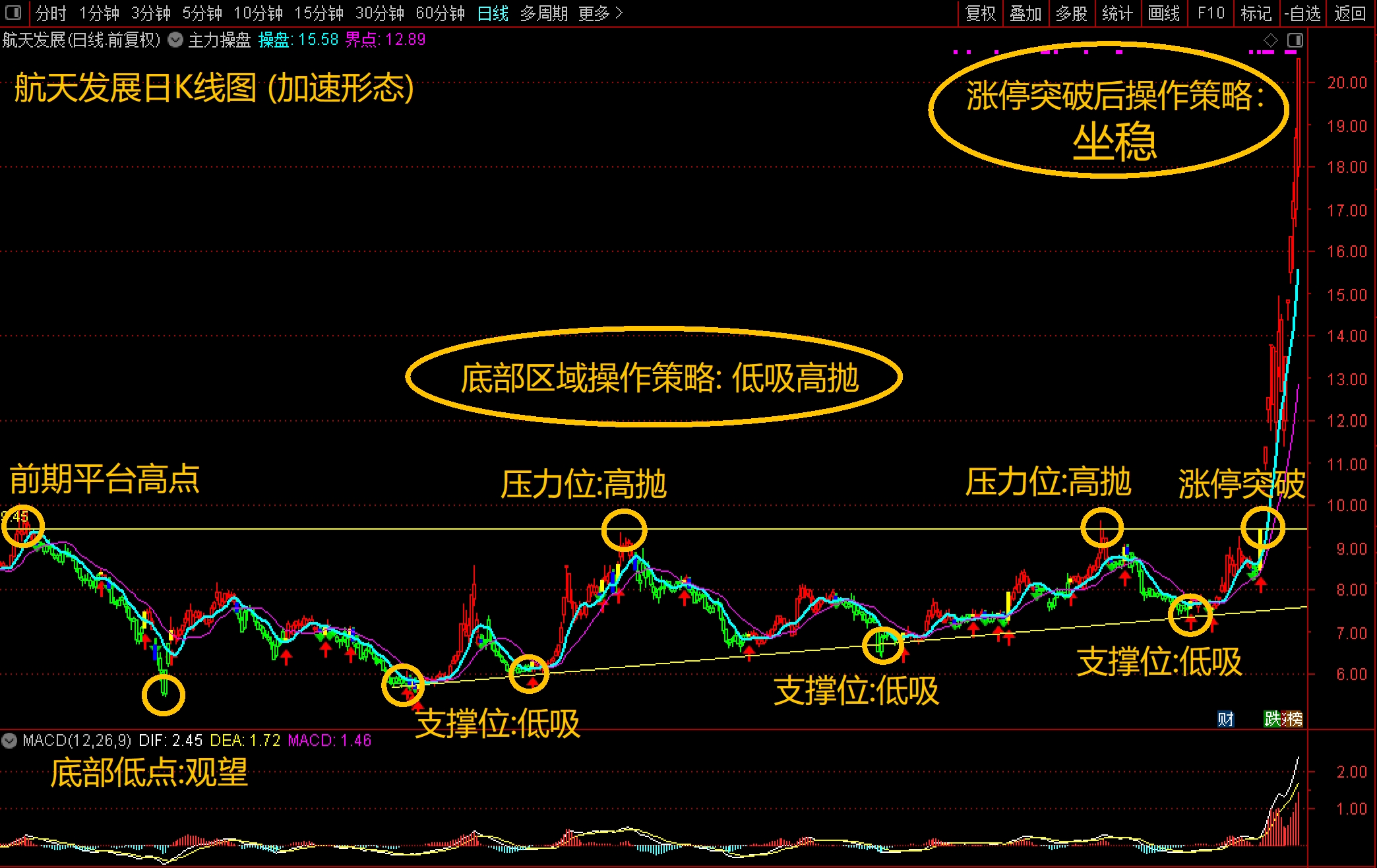 现给航天发展来个小结,把前几次文中零散操作思路与逻辑综合起来再简单拆解,让您一目了然,但愿有所感触或启发。文后再探讨几个类似品种,感兴趣可先参考,铁粉有缘可昵称搜索,偶遇微风送信,信中共商低位潜伏时机、底部启动形态、小A核心资产操作逻辑以及翻倍的那点事。