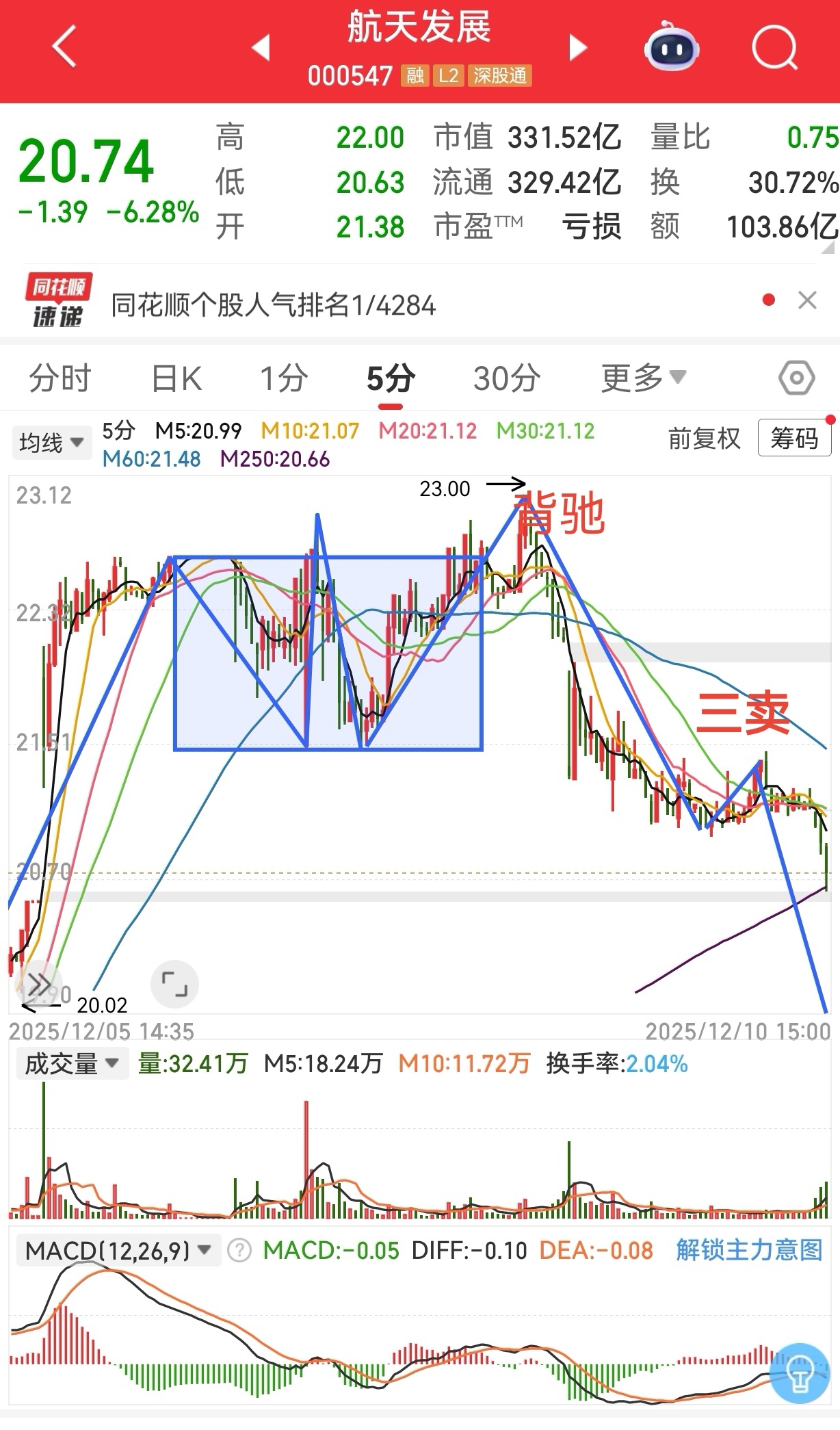 $航天发展(SZ000547)$ 多杀多踩踏行情,100 亿的盘子崩盘,没有一片雪花是无辜的!这一波拉升本来就已经是二波行情,二波滞涨买盘枯竭导致崩盘再正常不过了。技术面上 1 分钟级别 23 元明显背驰,跌破中枢后下午做了三卖,明天将开始加速下跌,5 分钟级别下跌趋势才刚刚开连个中枢结构都还没有,明天多杀多踩踏极容易走加速跌停,短线跌 15% 再说吧。