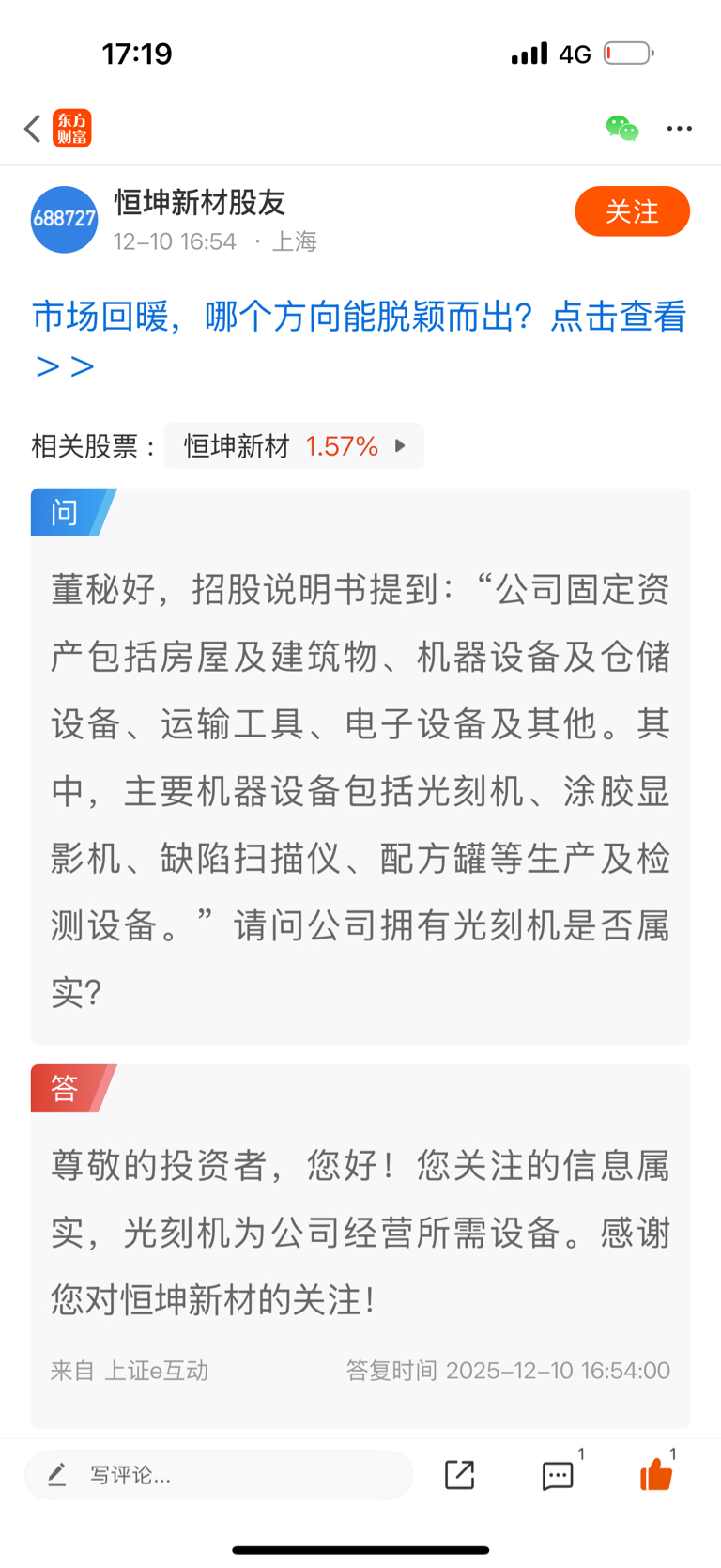温馨提示: 1.根据《证券法》规定,禁止编造、传播虚假信息或者误导性信息,扰乱证券市场;2.用户在本社区发表的所有资料、言论等仅代表个人观点,与本网站立场无关,不对您构成任何投资建议。用户应基于自己的独立判断,自行决定证券投资并承担相应风险。《东方财富社区管理规定》