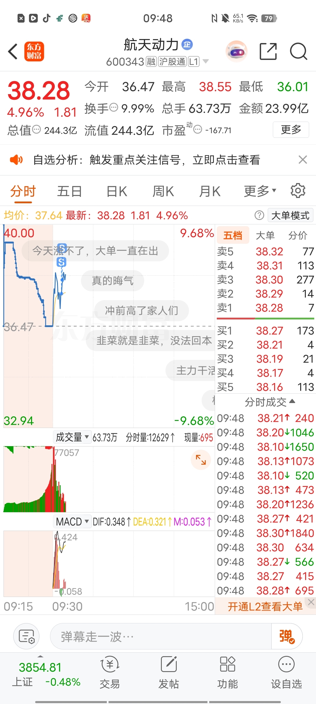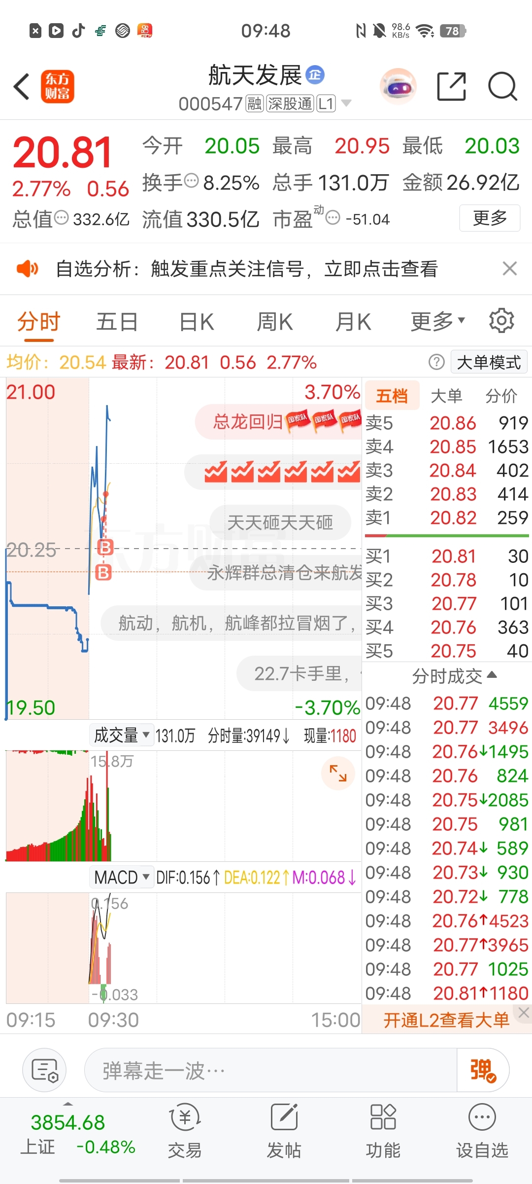 $航天发展(SZ000547)$ 今天卖出航天动力,加仓航天发展。今天一开盘就知道了,消费已经凉凉,只剩下福建和商业航空。而福建是主线,昨天大跌一天就是黄金坑,而航天发展双主线龙头,已经调整到位,人气也下降了。人弃我取。