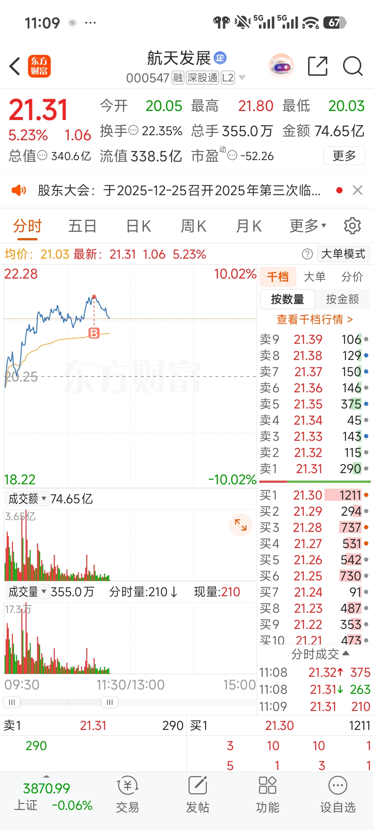 $航天发展(SZ000547)$ 又把我挂山顶了