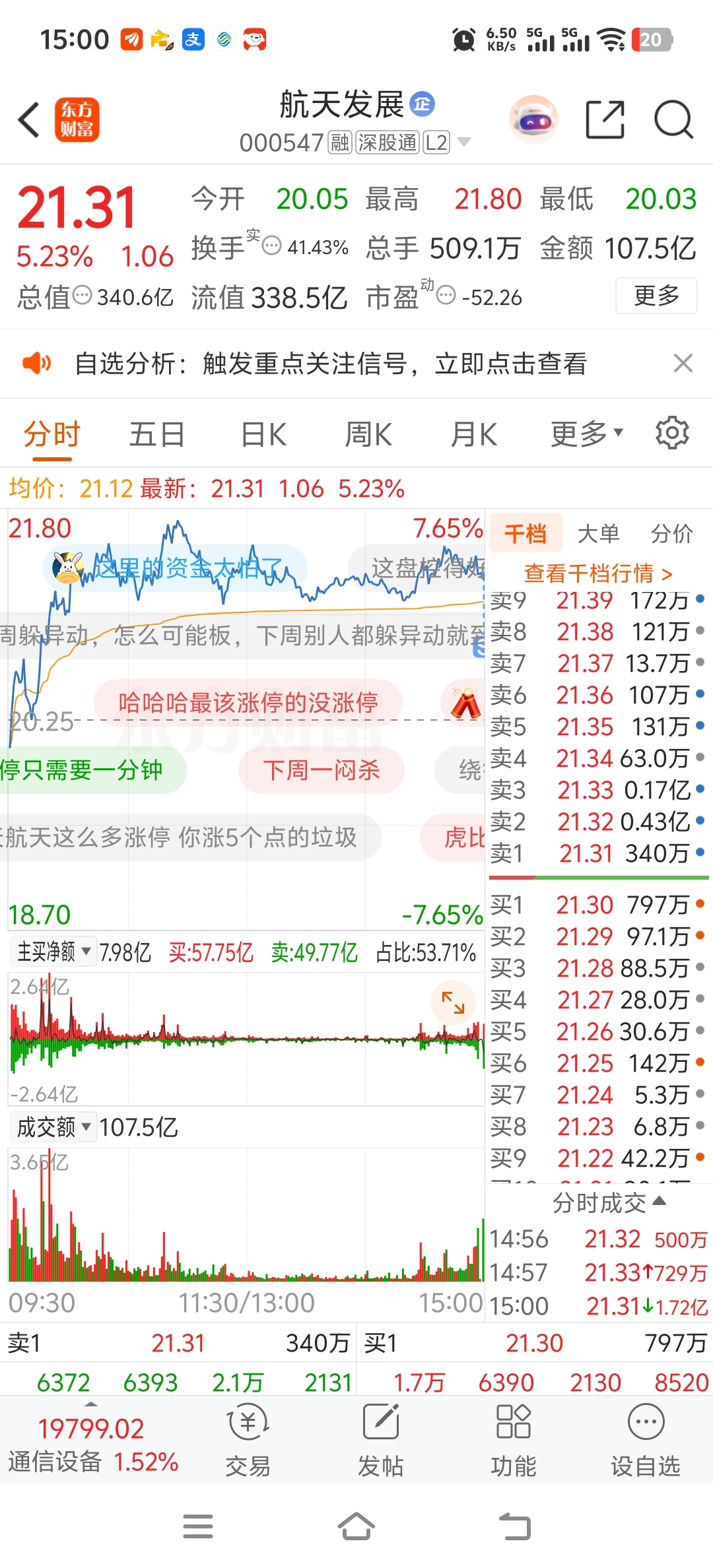 $航天发展(SZ000547)$ 板块这么强,今天还勉强收在五天线,好在是前几天低点买的,今天还赚了两个点,集合竞价减仓了。而且量能也是两万亿,近期两万亿就是顶点,下周一有低开的机会再回来,真不如动力,动力我4000股是真一股舍不得卖