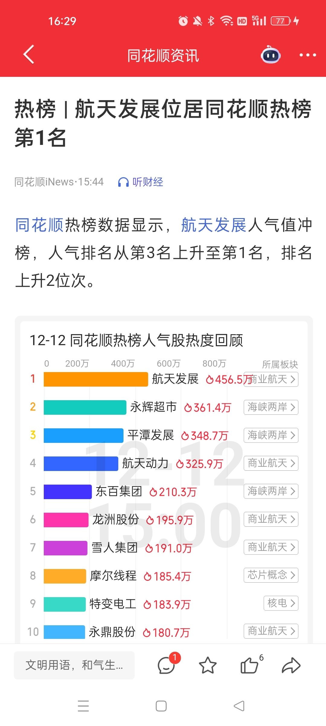 $航天发展(SZ000547)$ 这个热榜厉害,确实今天航发站稳后,商业航空板块甚至整个市场都有阳气了。