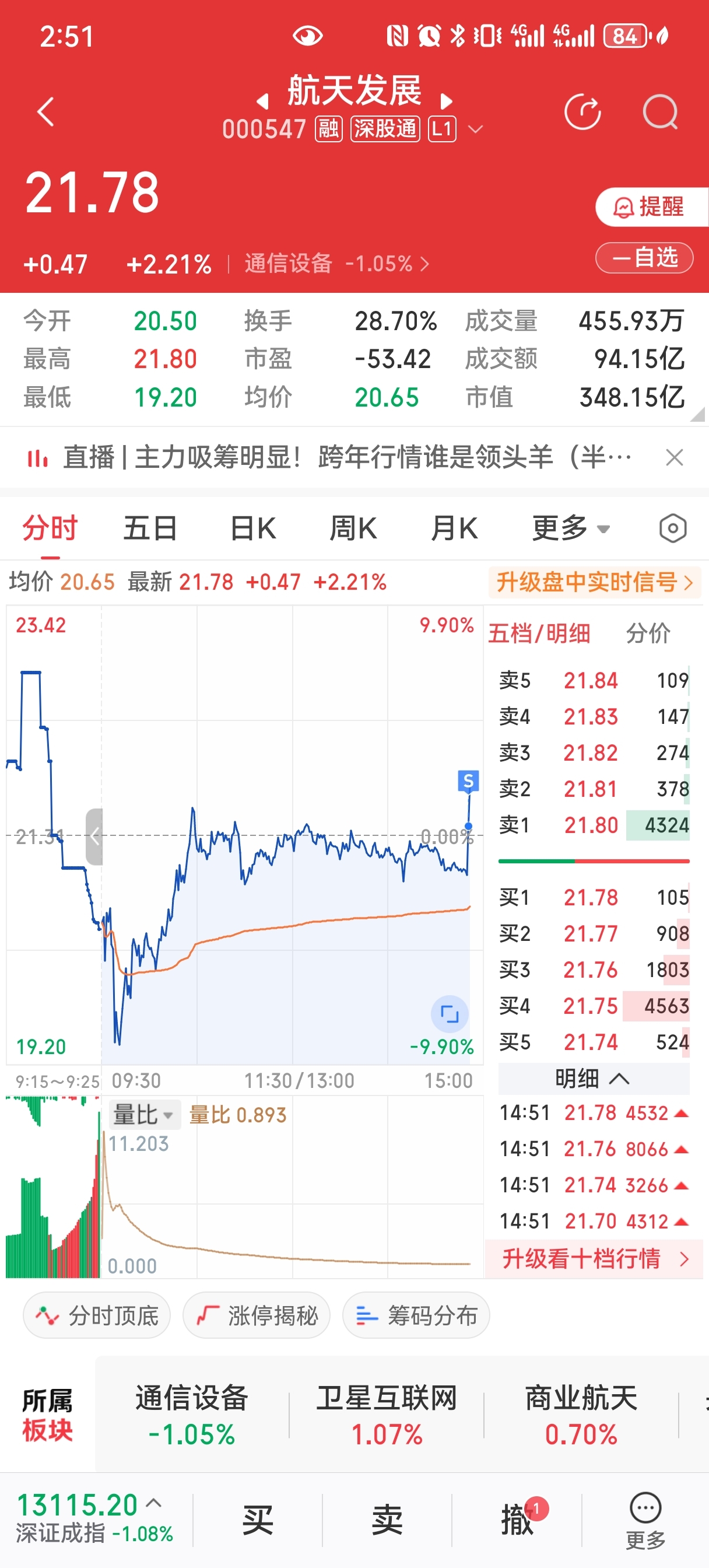 $航天发展(SZ000547)$ 真就在等我 前一秒21.94卖出 下一秒猛拉