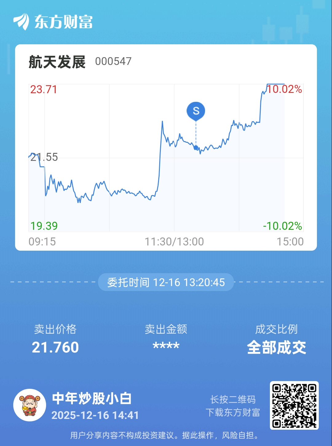 $航天发展(SZ000547)$ 月初开始赚的的在里面就没走,后来就是震荡下跌,我就去学人家做T人虽然笨但是手气还行T了几次基本持平小赚,知道今天我又买了一部分打算明天再拉进来的,结果没明天了!