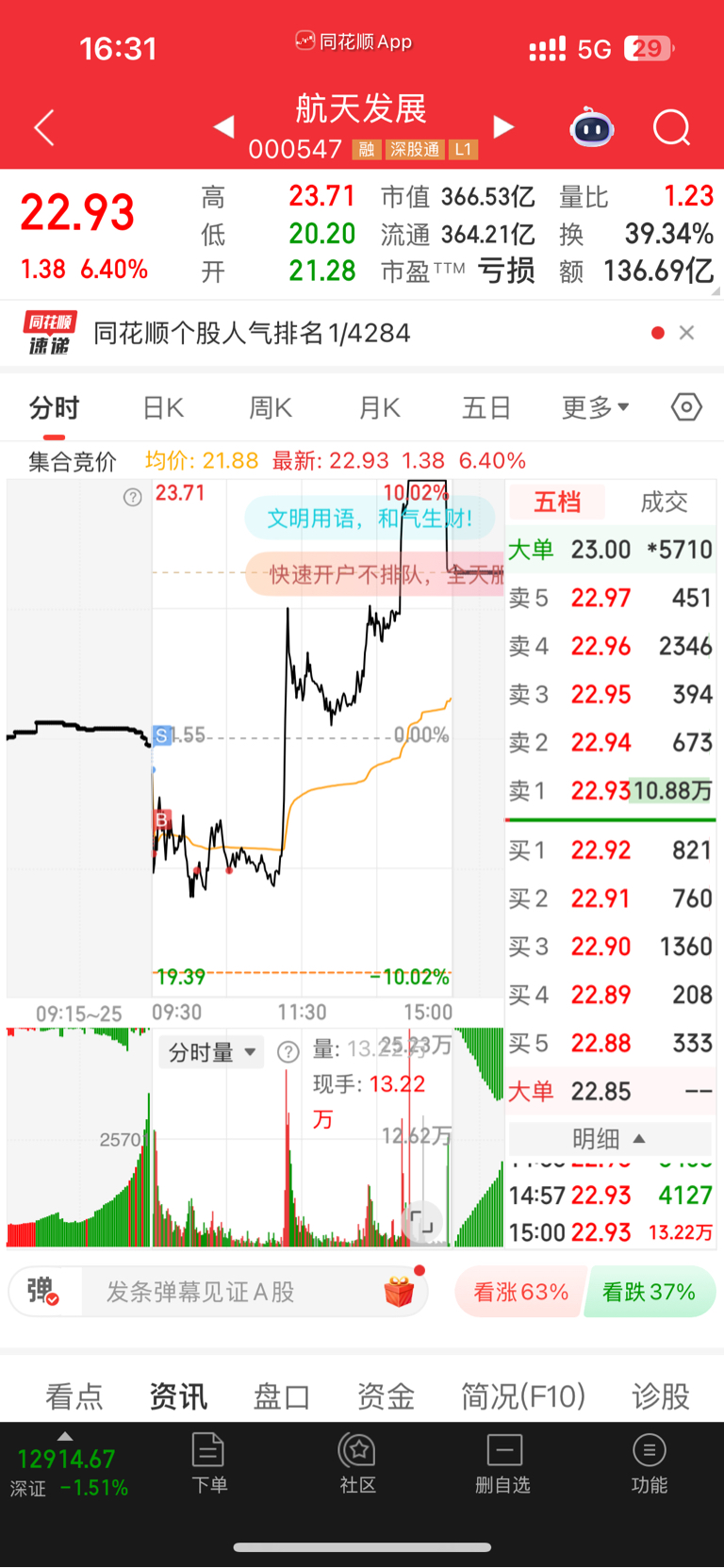 个人看法,下午航发拉涨停结果导致平潭拉不住了散户猛猛往里面冲,主力猛砸都拉不住怕