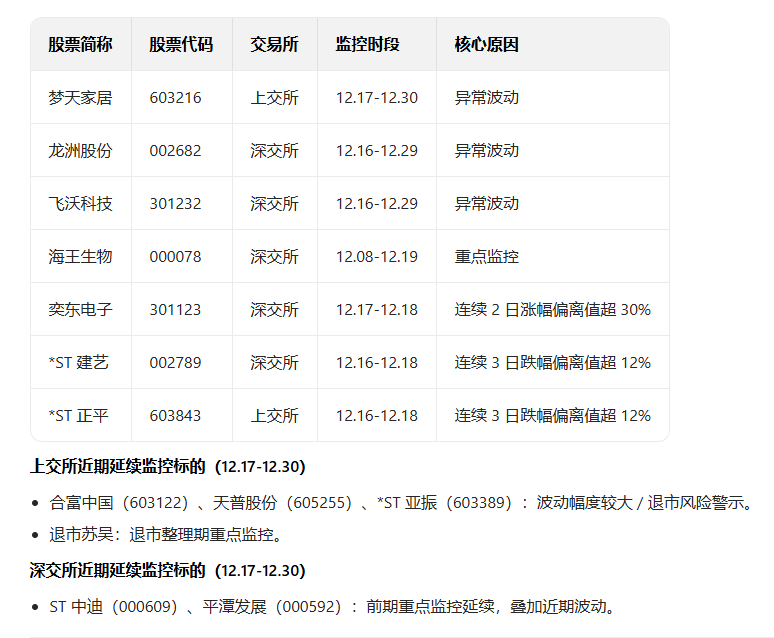 截至2025年12月19日(当日交易所最新披露口径),A股异动监管名单(含重点监