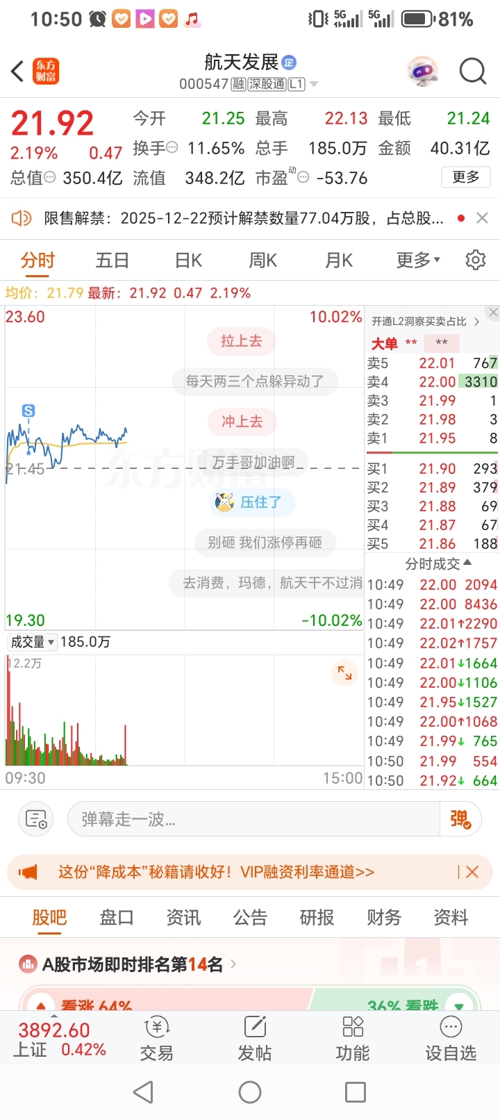 $航天发展(SZ000547)$ 出身佬子卖了你涨停啊