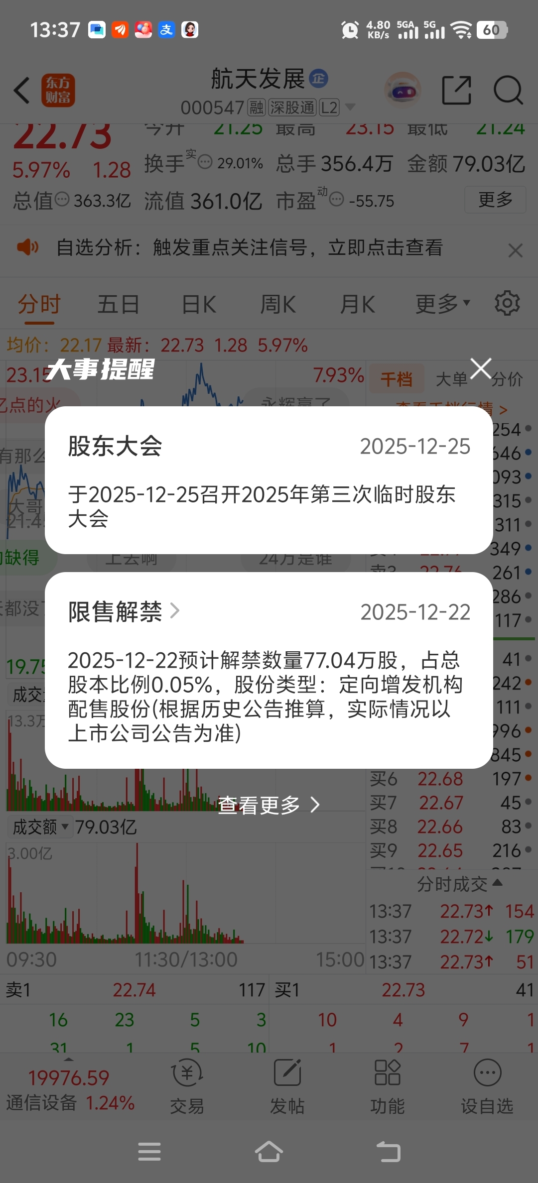 $航天发展(SZ000547)$ 下周一解禁77万手是不是应该跑了