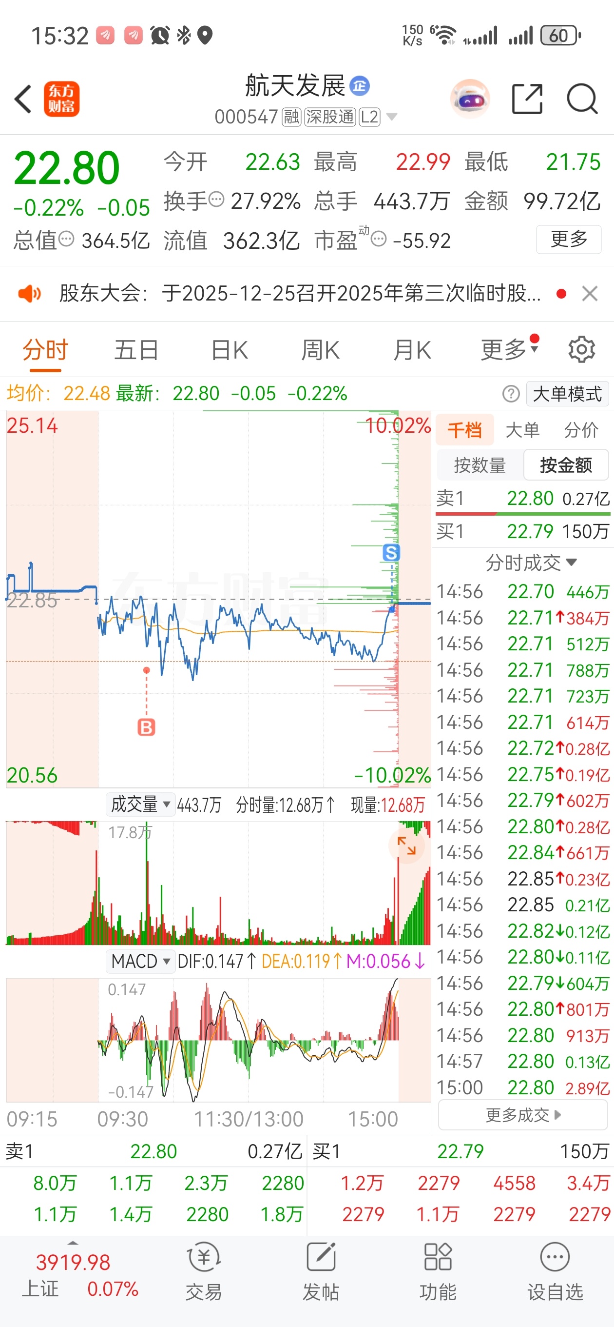 $航天发展(SZ000547)$ 几次红盘贪心不肯出,还是得感谢市场给机会