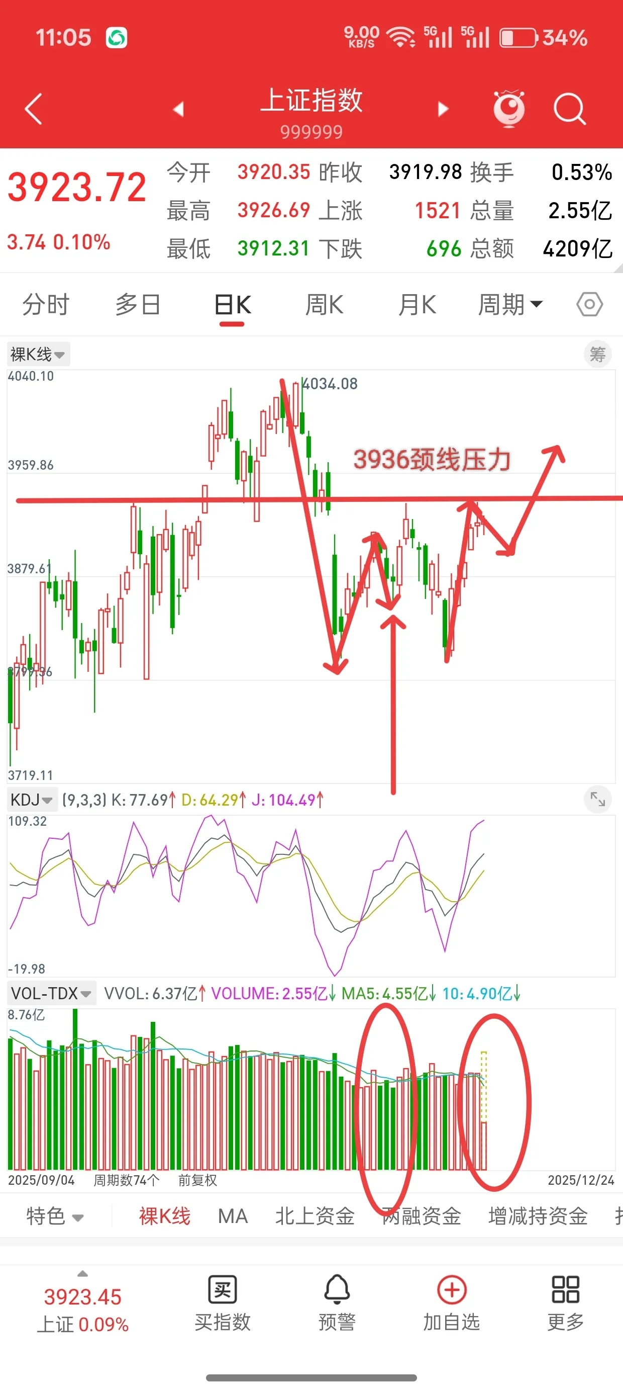 压力就是3936颈线,这里不放量突破,且收盘前不站上,不建议追涨。