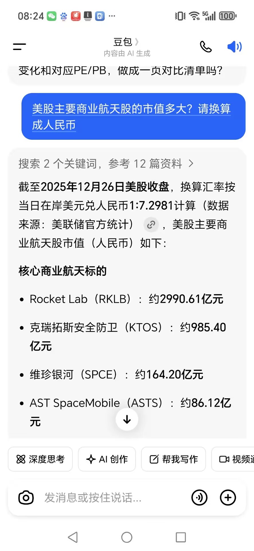 我们市值最大的航天股市中国卫通,目前市值才1000亿人民币!不到人家20分之一,所以,我们的商业航天股不管漂亮国的商业航天股涨跌,都是上涨!
