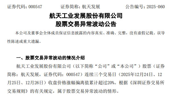 12月29日,航天发展发布公告表示,公司连续三个交易日(12月24日、25日、26日)收盘价格涨幅偏离值累计超过20%。公司就有关事项征询了公司实际控制人中国航天科工集团有限公司及控股股东中国航天系统工程有限公司,作出情况说明。