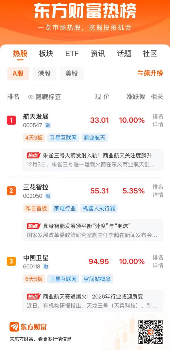 12月31日,两市震荡分化,三大指数涨跌不一。东方财富热榜前三的股票中,航天发展位列第1,三花智控位列第2,中国卫星位列第3。
