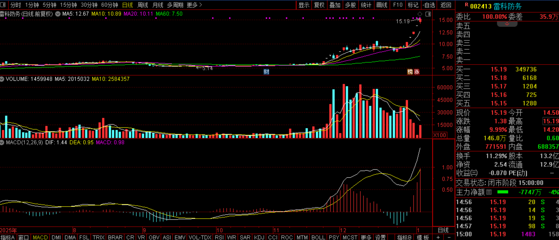 雷科防务(SZ002413):商业航天+存储芯片+毫米波雷达+卫星导航+车联网。昨日该股继续高开缩量快速封板,这是趋势的强化,因此后市继续走高大概率。由于该股已经突破,因此该股接下来最大挑战在于17.24这个阻力位的突破情况,一旦成功,后市或走出历史性高价,然由于短期已经5板,有超调需求,日内震荡分歧难免,不过这种依旧偏于机遇。