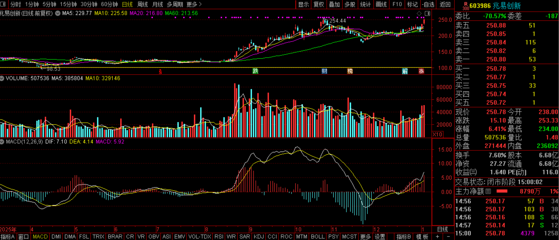 兆易创新(SZ603986):存储芯片+DRAM涨价+车规MCU+H股上市+机器人+业绩增长。昨日该股震荡探底稳稳走高,这种涨势是最稳定的,是上涨趋势的延续,料后市继续走高,预计今日该股有望继续拉涨,接下来所要关住的重点就是254.44突破的情况,如能顺利搞定,后市新一轮上涨启动。当然能否实现还得紫金流入以及大势配合。