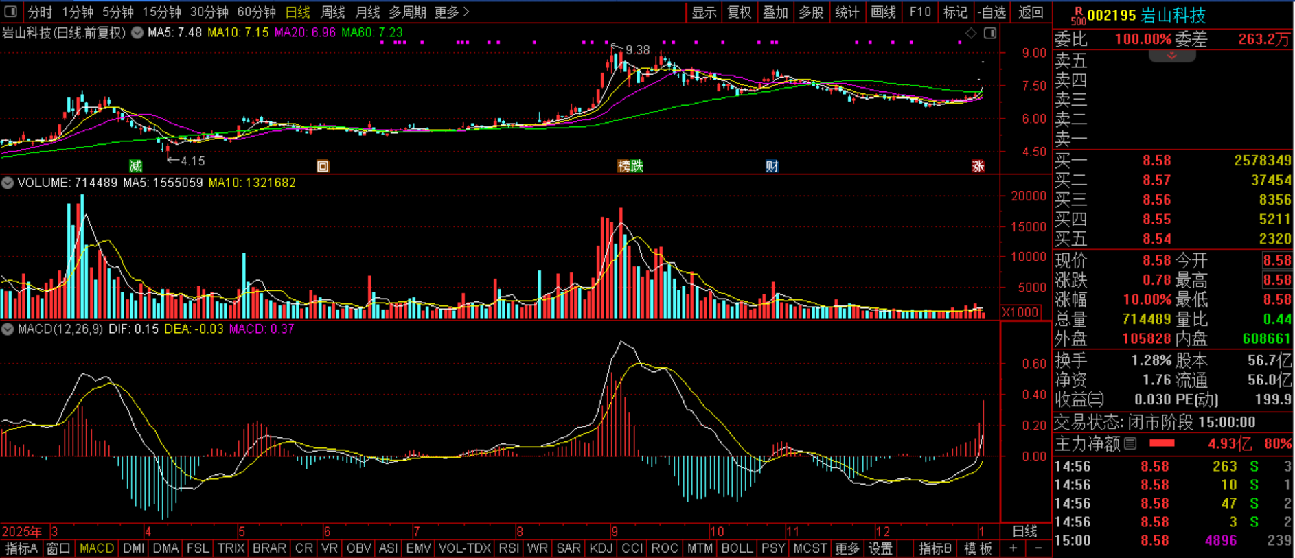 岩山科技(SZ002195):脑机接口+Yan大模型+人形机器人+AI应用。该股最近两日受脑机接口利好直接一字板,走出了一波上涨趋势,而该概念目前依旧潜力巨大,对后市预期仍在,所以后市仍将走高无忧。预计今日该股有望继续走高,如能突破9.38的话,后市新的上涨空间打开,后市冲击前高甚至历史高点可以期待,分歧走水的话,完全可以尝试研究。