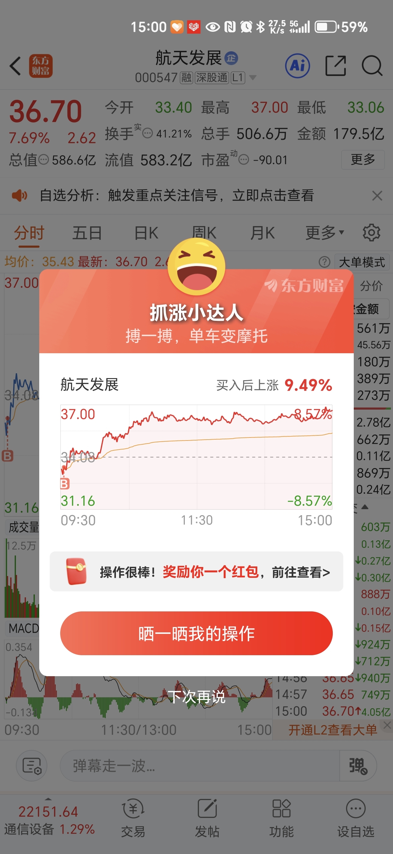 $航天发展(SZ000547)$ 成功抄底,昨天尾盘从航天电子转了一半过来航天发展,两头吃肉