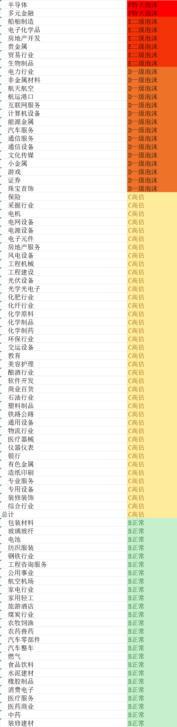 目前A股已无低估行业,大概率今年转向全面泡沫!