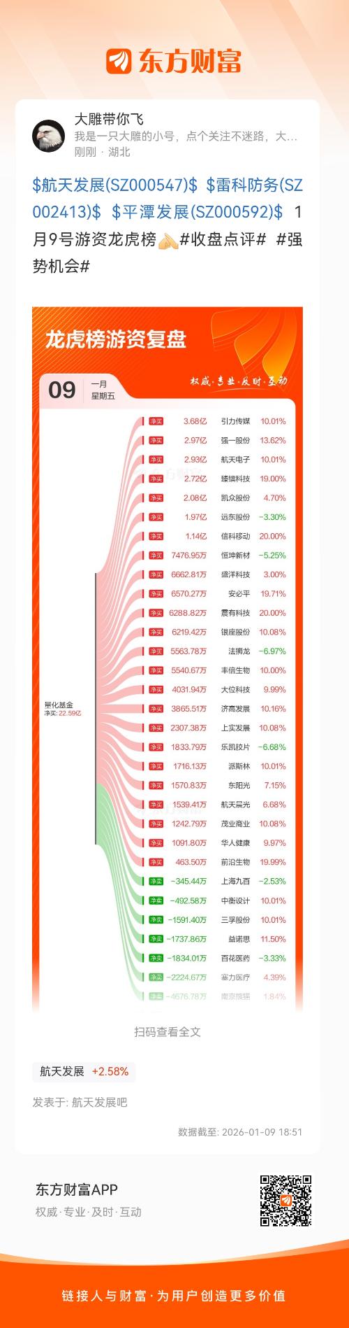 $航天发展(SZ000547)$ $雷科防务(SZ002413)$ $平潭发展(SZ000592)$ 1月9号游资龙虎榜