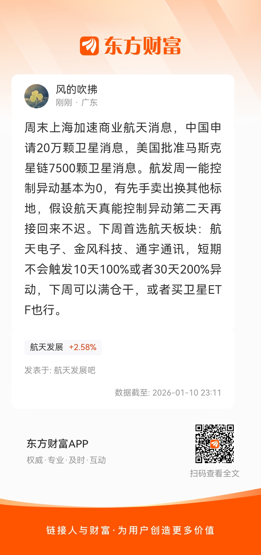 周末上海加速商业航天消息,中国申请20万颗卫星消息,美国批准马斯克星链7500颗卫星消息。航发周一能控制异动基本为0,有先手卖出换其他标地,假设航天真能控制异动第二天再接回来不迟。下周首选航天板块:航天电子、金风科技、通宇通讯,短期不会触发10天100%或者30天200%异动,下周可以满仓干,或者买卫星ETF也行。