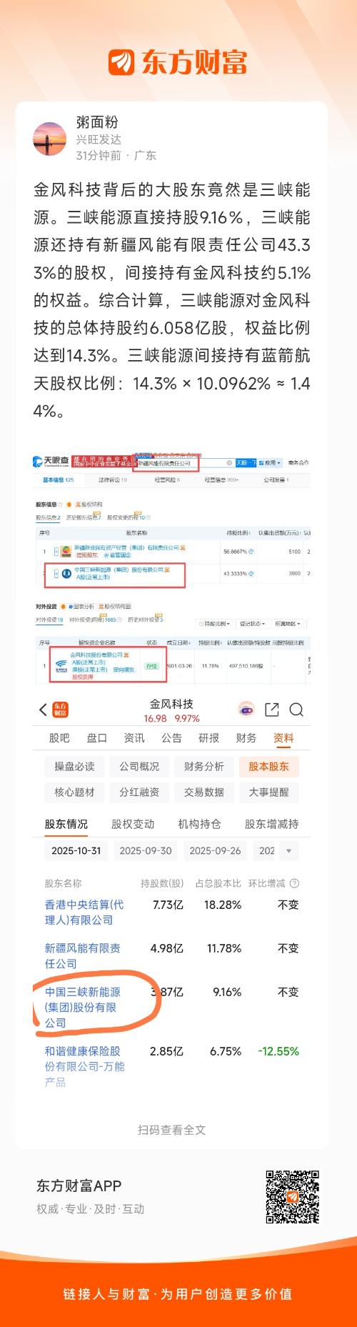 金风科技背后的大股东竟然是三峡能源。三峡能源直接持股9.16%,三峡能源还持有新疆风能有限责任公司43.33%的股权,间接持有金风科技约5.1%的权益。综合计算,三峡能源对金风科技的总体持股约6.058亿股,权益比例达到14.3%。三峡能源间接持有蓝箭航天股权比例:14.3% × 10.0962% ≈ 1.44%。