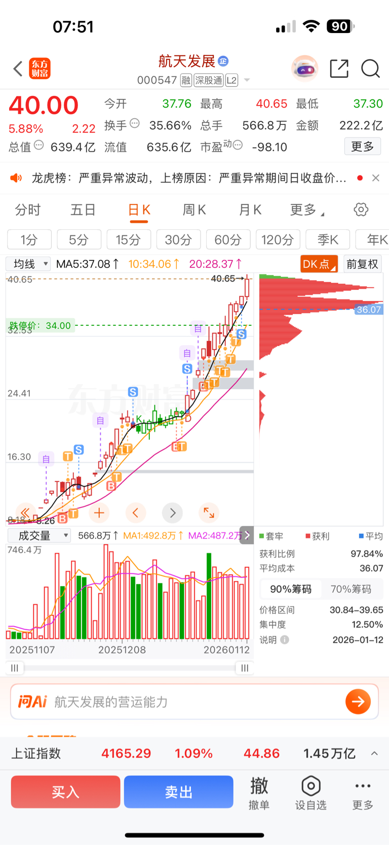 $航天发展(SZ000547)$ 反正我早就跑了 ,压不住就没接回来 行情没结束等着调整吧 !昨天确实吓到我了 ,那么多票大涨太疯狂了 。