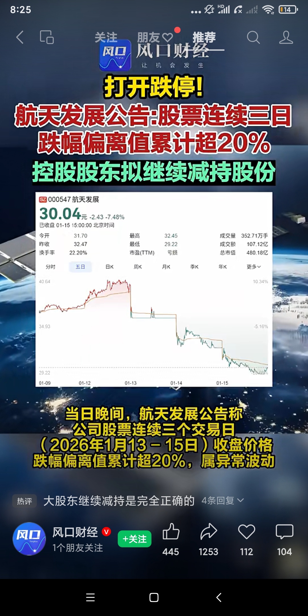 $航天发展(SZ000547)$ 大股东拟继续减持股份,航天发展上了微信头条!后市不妙…!