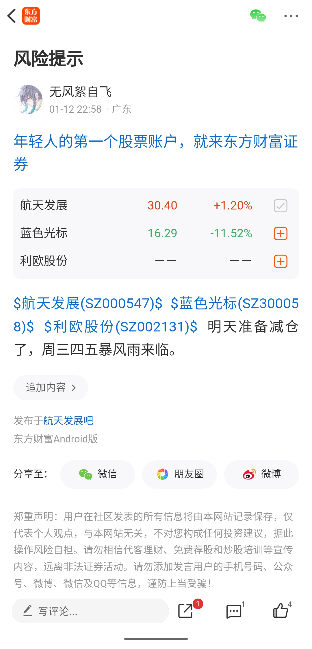 温馨提示: 1.根据《证券法》规定,禁止编造、传播虚假信息或者误导性信息,扰乱证券市场;2.用户在本社区发表的所有资料、言论等仅代表个人观点,与本网站立场无关,不对您构成任何投资建议。用户应基于自己的独立判断,自行决定证券投资并承担相应风险。《东方财富社区管理规定》