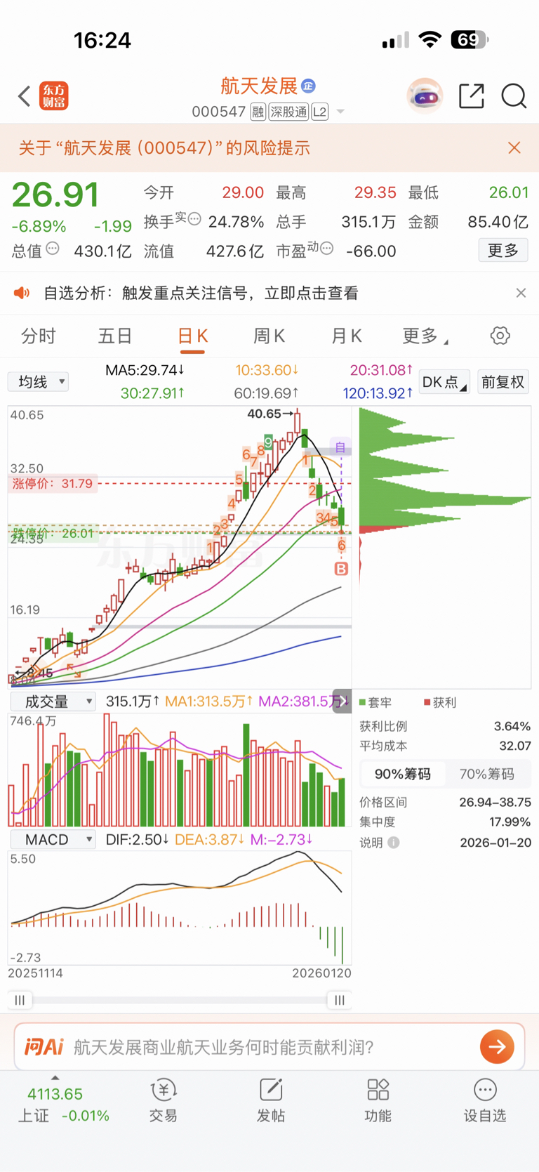 $航天发展(SZ000547)$ 集合竞价观望一下,大盘要变天了,很可能近期要击穿4000点,不行明天,卖出所有股票,留个底仓,穷怕了