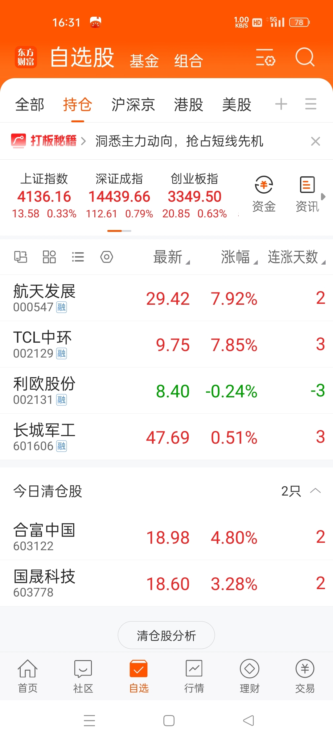 $航天发展(SZ000547)$ 今日持仓详情,竞价抄底利欧股份,TCL中环,做T航发,午盘卖掉合富,国晟,周一回流合富中国,卖掉航发,