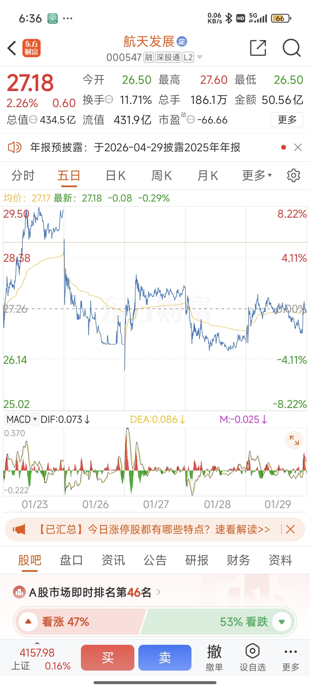 $航天发展(SZ000547)$ 一天强势均线上,一天弱势下,市场风格还是变了,龙味不对,还有啊明天没表现就是周线三连阴,明天看有机会博一下下周阳线