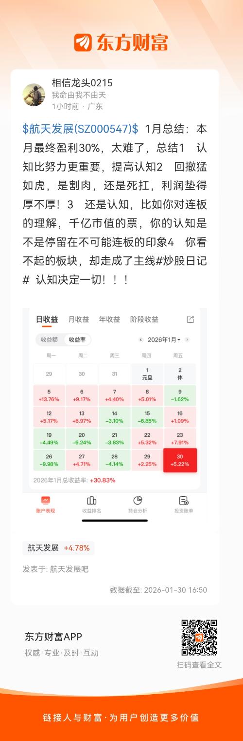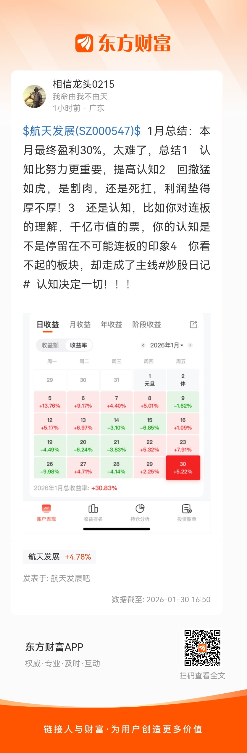 $航天发展(SZ000547)$ 1月总结:本月最终盈利30%,太难了,总结1⃣认知比努力更重要,提高认知2⃣回撤猛如虎,是割肉,还是死扛,利润垫得厚不厚!3⃣还是认知,比如你对连板的理解,千亿市值的票,你的认知是不是停留在不可能连板的印象4⃣你看不起的板块,却走成了主线#炒股日记# 认知决定一切!!!