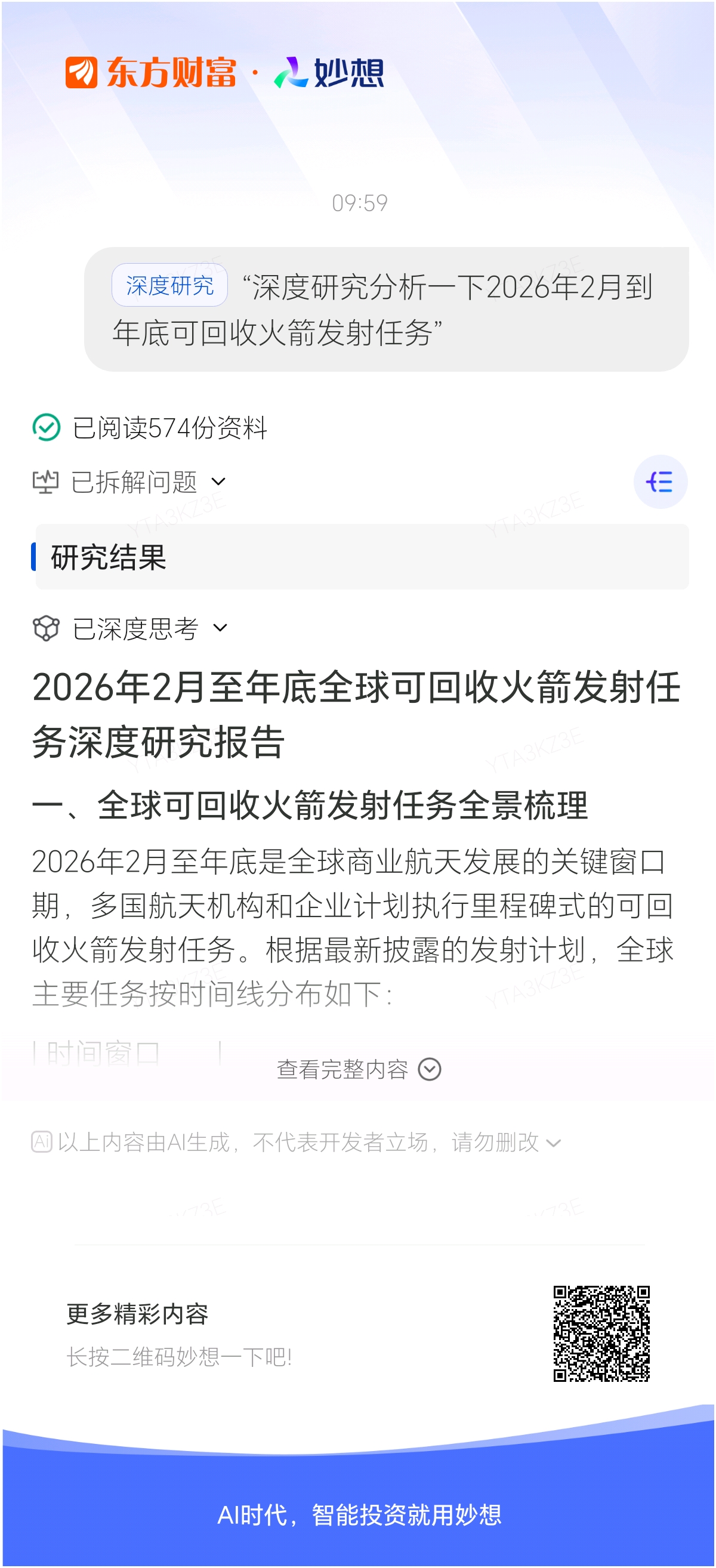 妙想一下:“深度研究分析一下2026年2月到年底可回收火箭发射任务”
