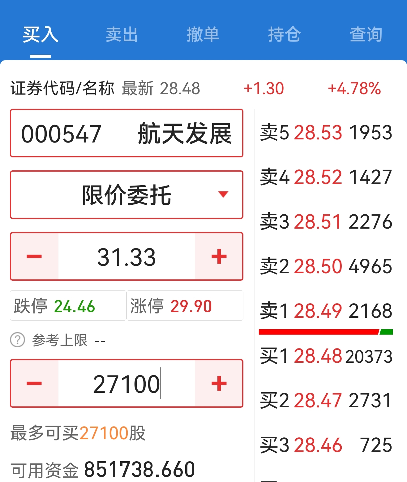 $航天发展(SZ000547)$ 周一涨停价是31.33元,多么吉利的数字,我干脆报31.33元