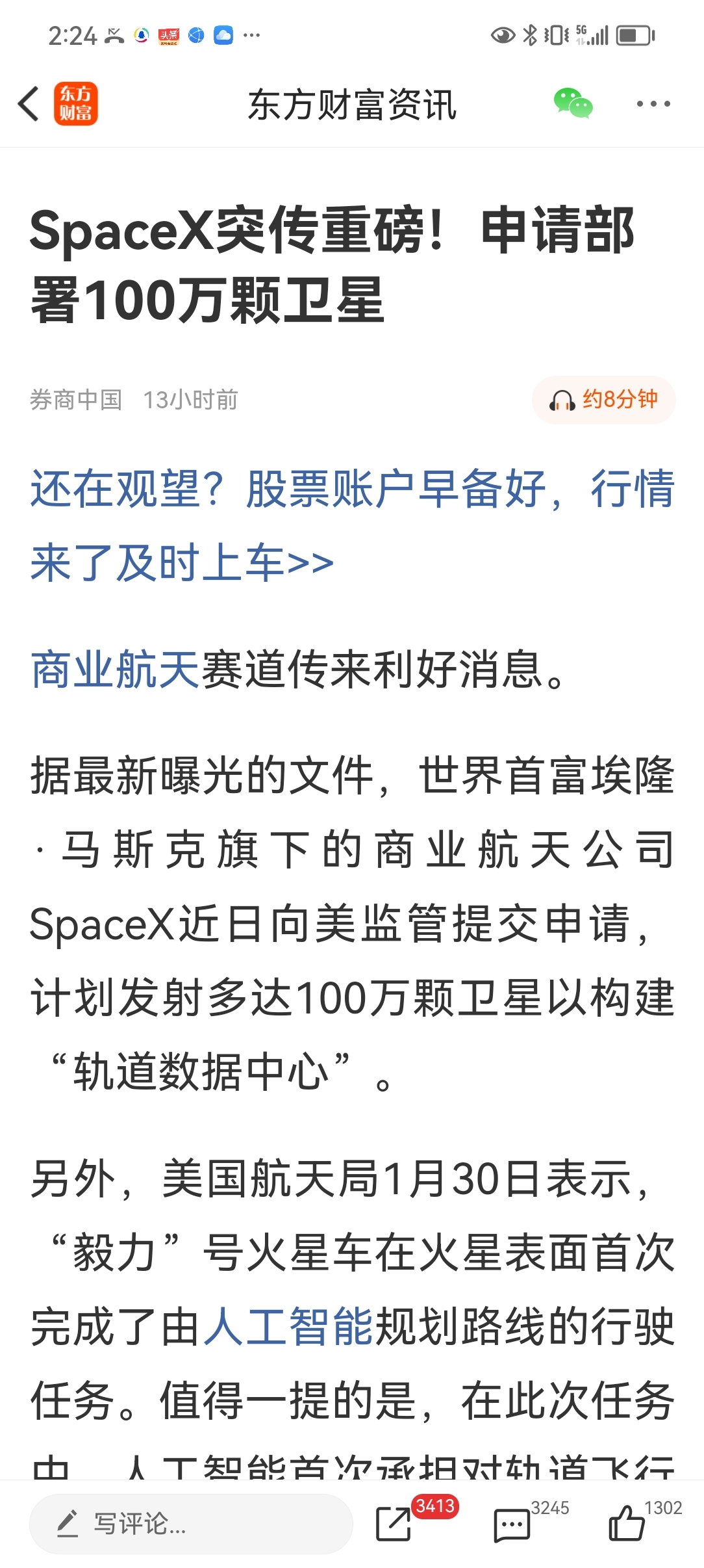 那些唱空的一点认知都没有。去查查吧。Spacex申请部署100万颗卫星对于全球对