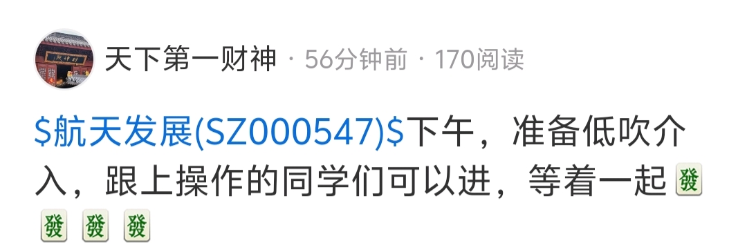 $航天发展(SZ000547)$ 准备起飞了,恭喜跟上的低吸的小伙伴们。又是吃肉的一天,