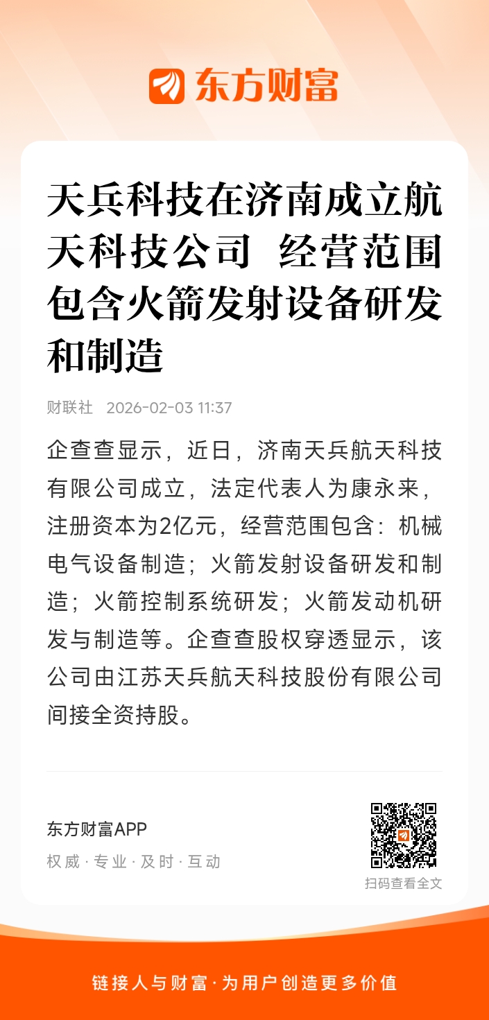 企查查显示,近日,济南天兵航天科技有限公司成立,法定代表人为康永来,注册资本为2亿元,经营范围包含:机械电气设备制造;火箭发射设备研发和制造;火箭控制系统研发;火箭发动机研发与制造等。企查查股权穿透显示,该公司由江苏天兵航天科技股份有限公司间接全资持股。