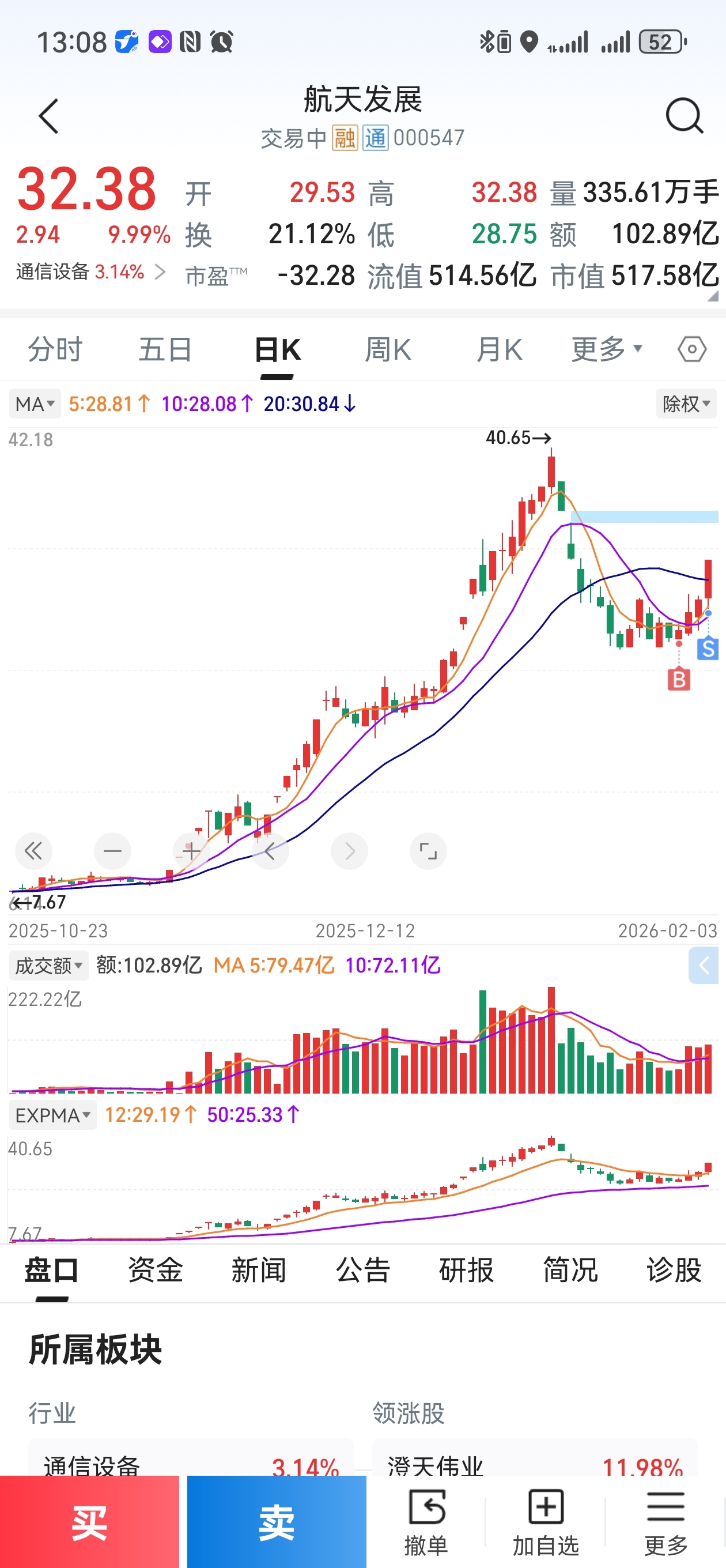 $航天发展(SZ000547)$ 挂32.10被一口吃掉撤单都来不及,卖飞了好气