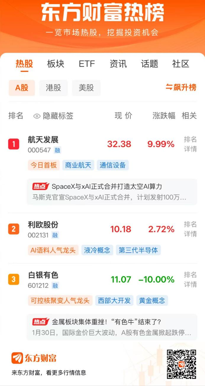 2月3日,两市集体反弹,三大指数均涨超1%。东方财富热榜前三的股票中,航天发展位列第1,利欧股份位列第2,白银有色位列第3。