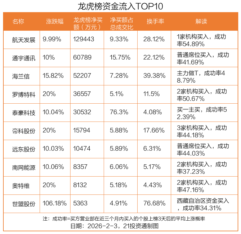 2月3日,上证指数上涨1.29%,深证成指上涨2.19%,创业板指上涨1.86%。盘后龙虎榜数据显示,共有56只个股因当日异动登上龙虎榜,资金净流入最多的是航天发展(000547.SZ),达12.94亿元。
