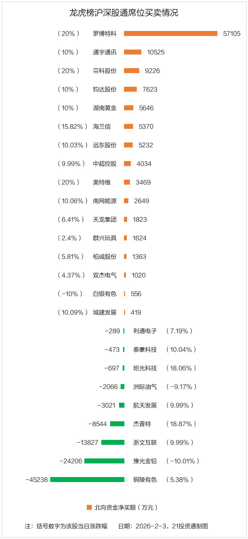 2月3日,北向资金参与龙虎榜中的个股共有25只,合计净买入1.93亿元。其中沪股通净买入5 股,净卖出7 股,合计净卖出3.91亿元;深股通净买入11 股,净卖出2 股,合计净买入5.84亿元。
