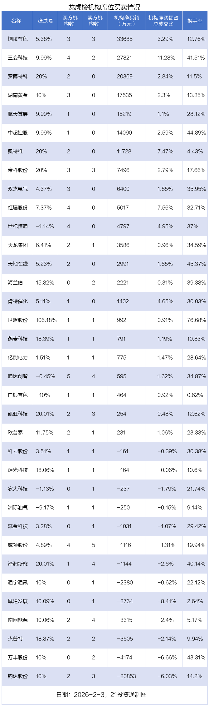 其中,机构净买入金额最多的是铜陵有色(000630.SZ),当日收盘上涨5.38%,换手率为12.76%。