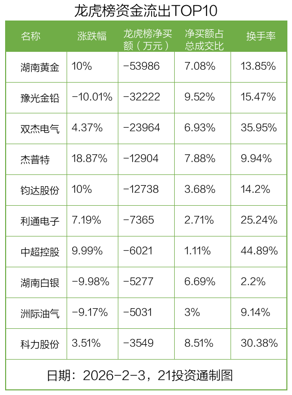 而龙虎榜中资金净流出最多的是湖南黄金(002155.SZ),被净卖出为5.4亿元,占总成交金额的7.08%。湖南黄金收盘上涨10%,换手率为13.85%。