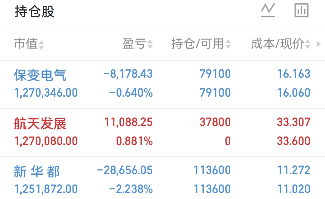 持有:$新 华 都(SZ002264)$ $保变电气(SH600550)$ 早上有利润没撤,就在等等了,问题不大!
