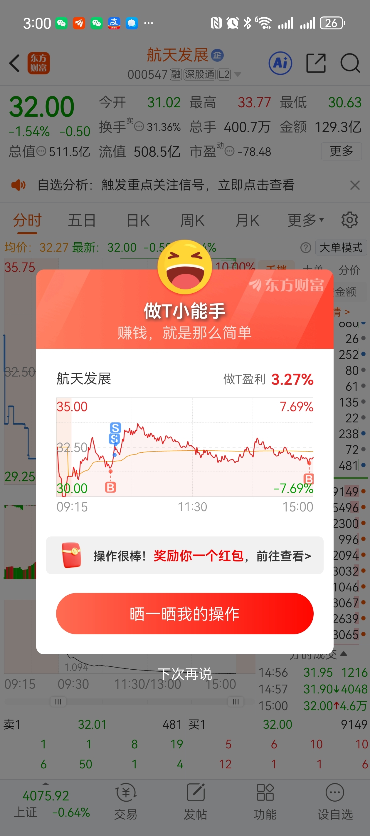 $航天发展(SZ000547)$ 尾盘31.69接回了一点。现在仓位不重,不惧明天的涨跌,随时做好防守。现在这个趋势是拐弯向下,还是保持趋势,看明天了