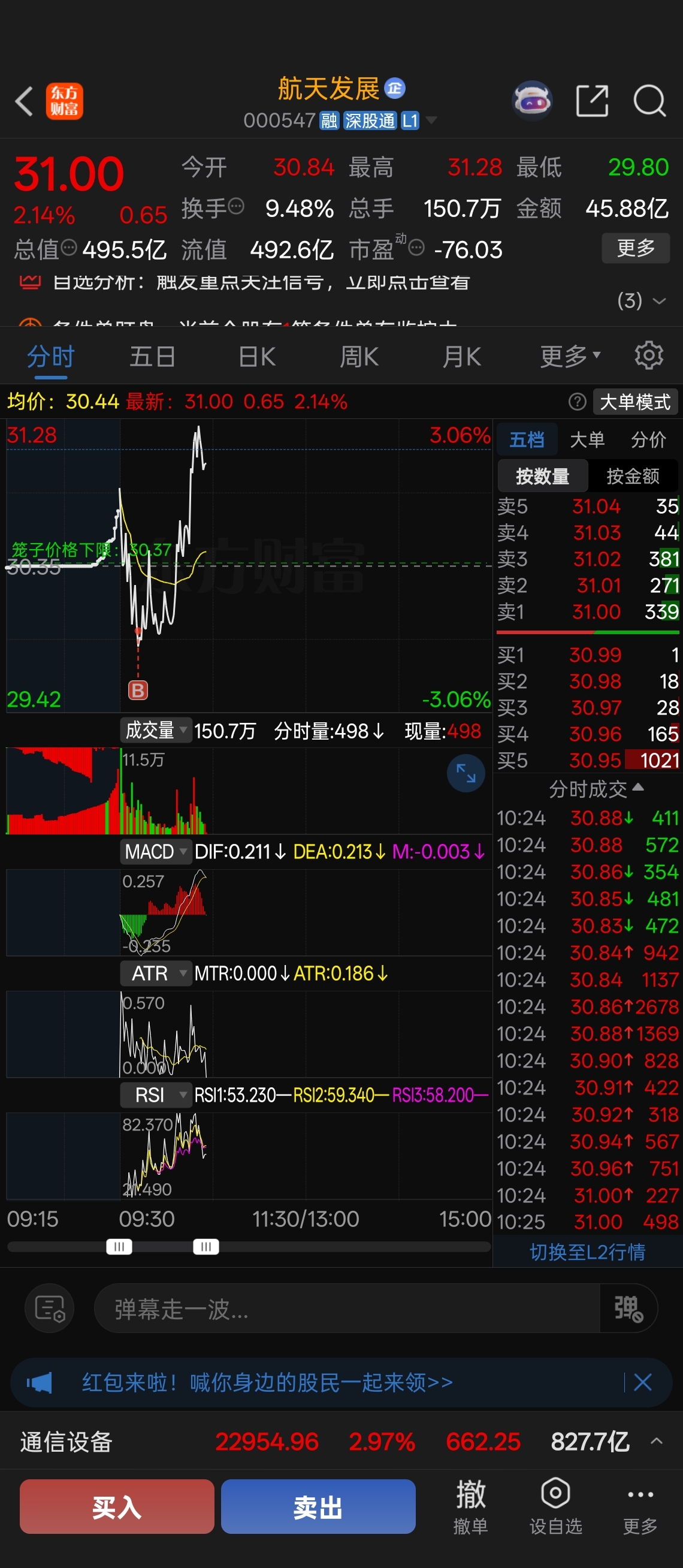 $航天发展(SZ000547)$ 上周四出现D点+今日低点低于平均价,逢低建仓。