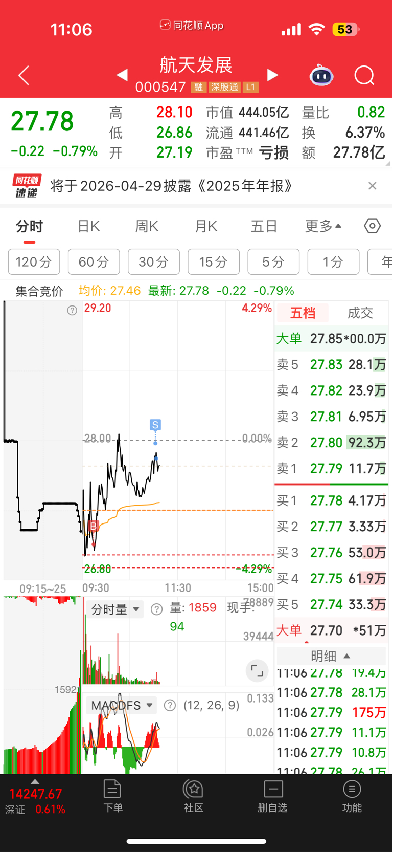$航天发展(SZ000547)$ 朱莉 我卖完了 目前就剩0.5层 明天你给我剩点 我赚钱我就走了 跌破我成本我就加仓