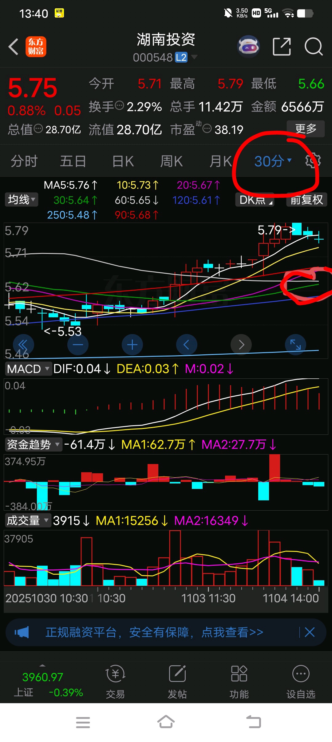 $湖南投资(SZ000548)$ 30分时图等60日线靠拢,回踩确认,3阳2阴,起飞