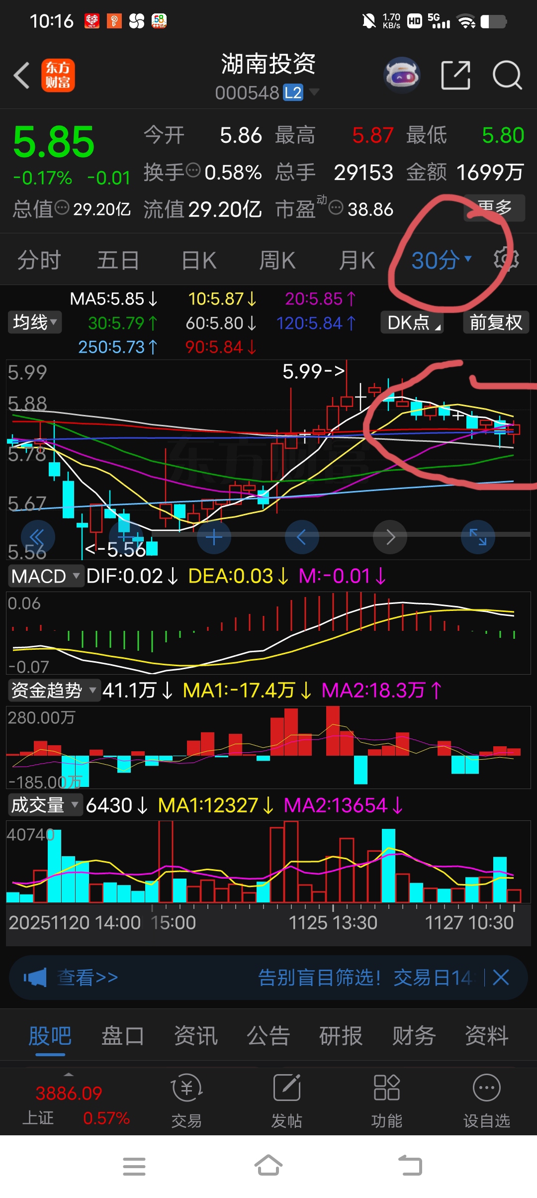 $湖南投资(SZ000548)$ 这个币,30分时图是真能控盘,不得不服,每跌0.5就涨0.34,服了,彻底服了